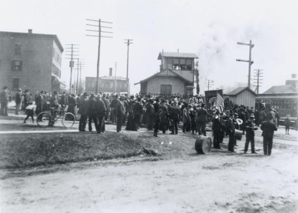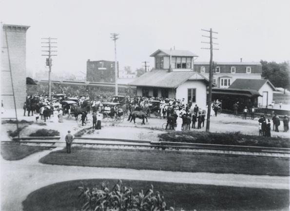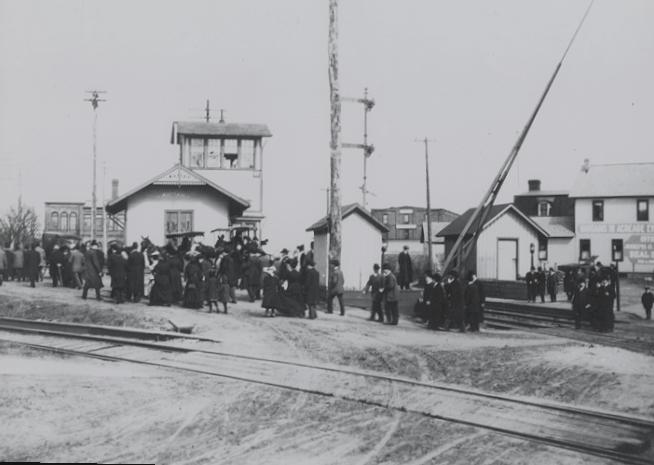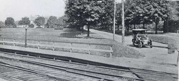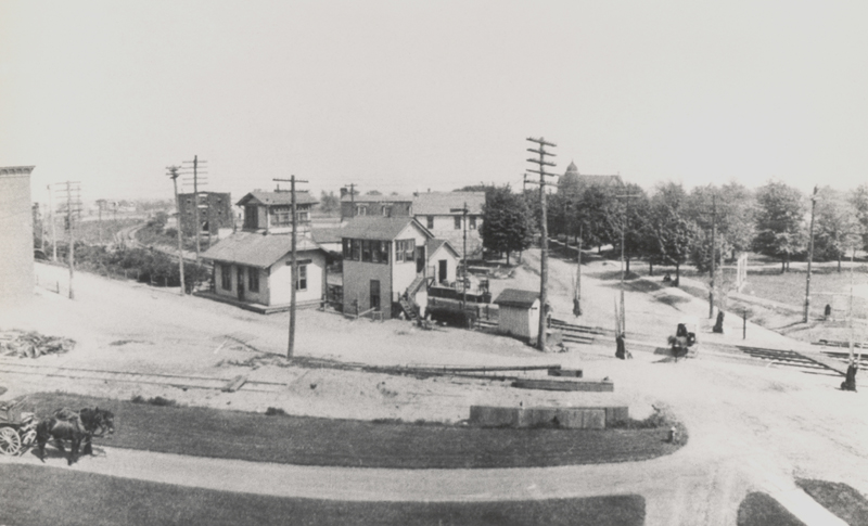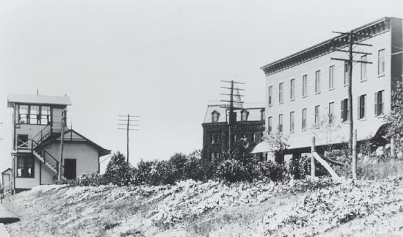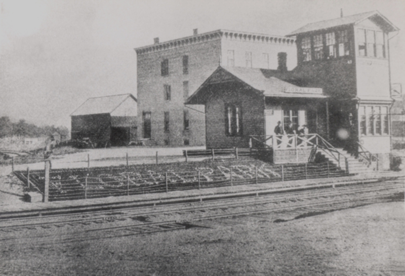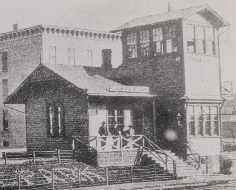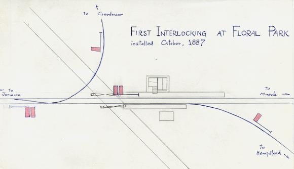 IN OCTOBER, 1887 THE TOWER AT EAST HINSDALE OPENED ABOVE THE 1878 STATION. TOWER NUMBER 43 HAD 24 LEVERS AND OPERATED THE CROSSING GATES AT TULIP AVENUE. RAILROAD GAZETTE ON FEBRUARY 10, 1888 REPORTED ON THE LONG ISLAND RAIL ROAD'S FOURTEEN INTERLOCKING PLANTS. "AT EAST HINSDALE A SET OF GATE ARMS FOR A HIGHWAY CROSSING IS WORKED FROM THE TOWER AND INTERLOCKED. AT THIS POINT AS WELL AS AT ALL THE TOWERS LATELY CONSTRUCTED, DERAILING SWITCHES ARE USED, AND THE STATEMENT IS MADE THAT 'THEY WORK VERY EFFECTUALLY IN PREVENTING ENGINES PASSING THE HOME SIGNALS'....." IN LATE 1889 OR 1890 EAST HINSDALE BECAME FLORAL PARK |