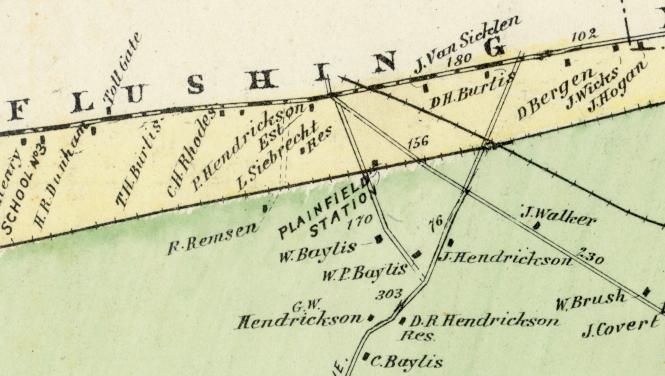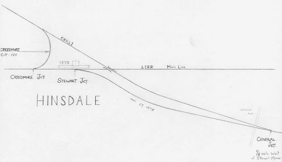 THE 1873 BEERS ATLAS AND THE RESEARCH OF WILLIAM D. SLADE INDICATE THAT BETWEEN 1873 AND 1878 THERE WAS A PLAINFIELD STATION JUST EAST OF CARNATION AVENUE. IT DOES NOT APPEAR IN 1874, 1877 OR 1878 TIMETABLES. ![]() IN 1873 THE CENTRAL RAIL ROAD OF LONG ISLAND CROSSED THE LONG ISLAND RAIL ROAD MAIN LINE BETWEEN QUEENS AND HYDE PARK STATIONS VIA AN OVERHEAD BRIDGE. IN 1878 STEWART JUNCTION STATION OPENED, A CONNECTION WAS BUILT FROM THERE TO CENTRAL JUNCTION AND THE CREEDMOOR CUT-OFF WAS BUILT. THIS TRACK ARRANGEMENT REMAINED INTO THE 1880'S AND PROVIDED A WYE FOR TURNING TRAINS. BY SEPTEMBER, 1879 THIS STATION BECAME HINSDALE, PROBABLY WITH THE CLOSING OF THE LINE FROM FLUSHING TO CREEDMOOR AND ITS HINSDALE STATION. IN JUNE 1885 THE STATION WAS STILL LISTED AS HINSDALE. BY OCTOBER 1887 AND AS LATE AS OCTOBER 1889 THE NAME WAS EAST HINSDALE WHICH BECAME FLORAL PARK BY 1890. SEE TIME TABLES ON STEWART LINE PAGE ONE |