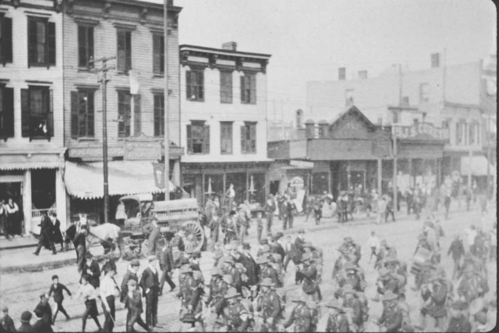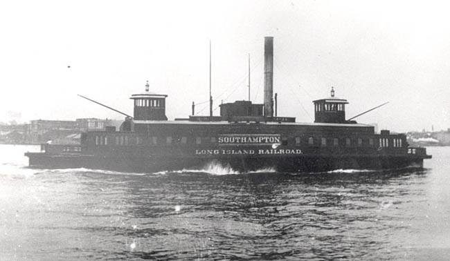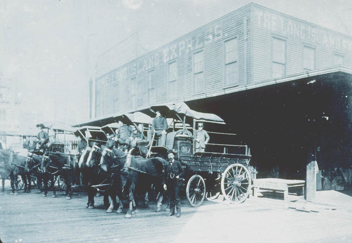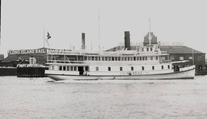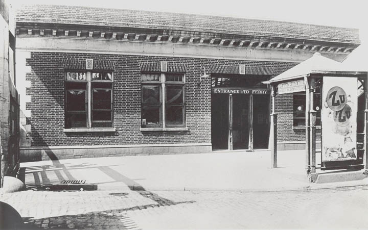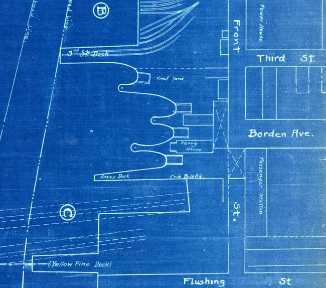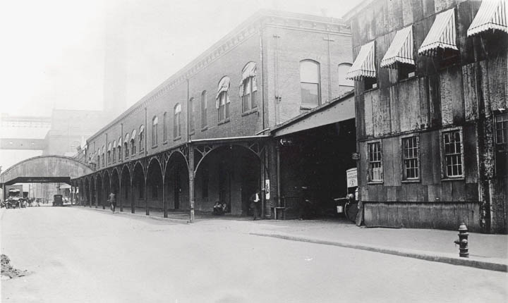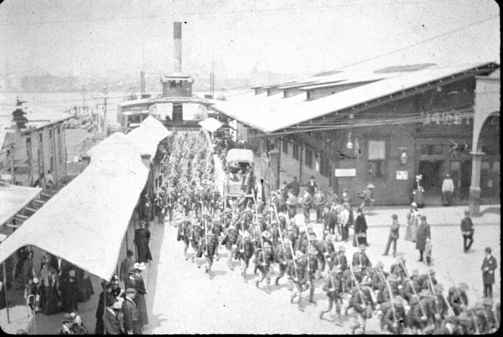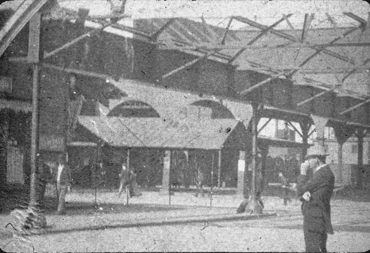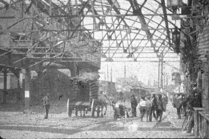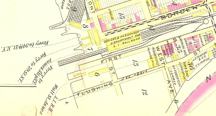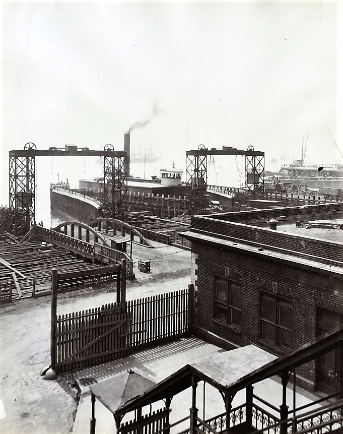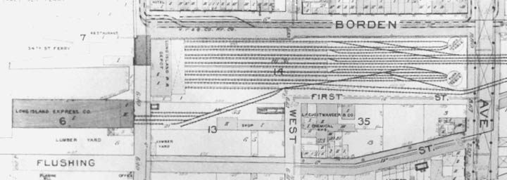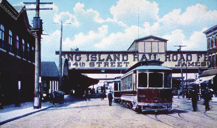 THIS IS A GREATLY ENLARGED PORTION OF A PHOTOGRAPH LOOKING NORTH ON FRONT STREET. AT THE LEFT IS THE OVERHEAD STRUCTURE AT THE ENTRANCE TO THE FERRY. IN THE DISTANCE ARE PASSENGER CARS. THE FLUSHING & NORTH SIDE TERMINAL WAS RARELY USED AFTER THE COMPANIES WERE MERGED WITH THE LONG ISLAND. PERHAPS IT WAS PRESSED INTO SERVICE DURING THE SPANISH AMERICAN WAR WHEN THESE PICTURES WERE TAKEN. POSSIBLY THAT IS THE F.& N.S. STATION BUILDING BEYOND THE FERRY STRUCTURE. |