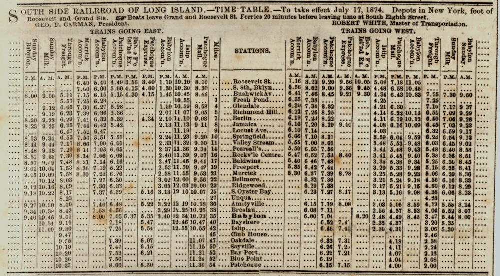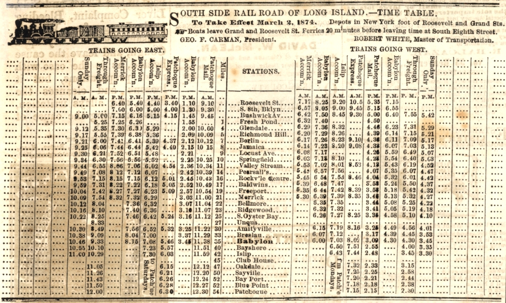 UNQUA STATION  APPEARS IN  THE SOUTH SIDE SIGNAL TIME TABLES OF MARCH 2 AND JULY 17, 1874.