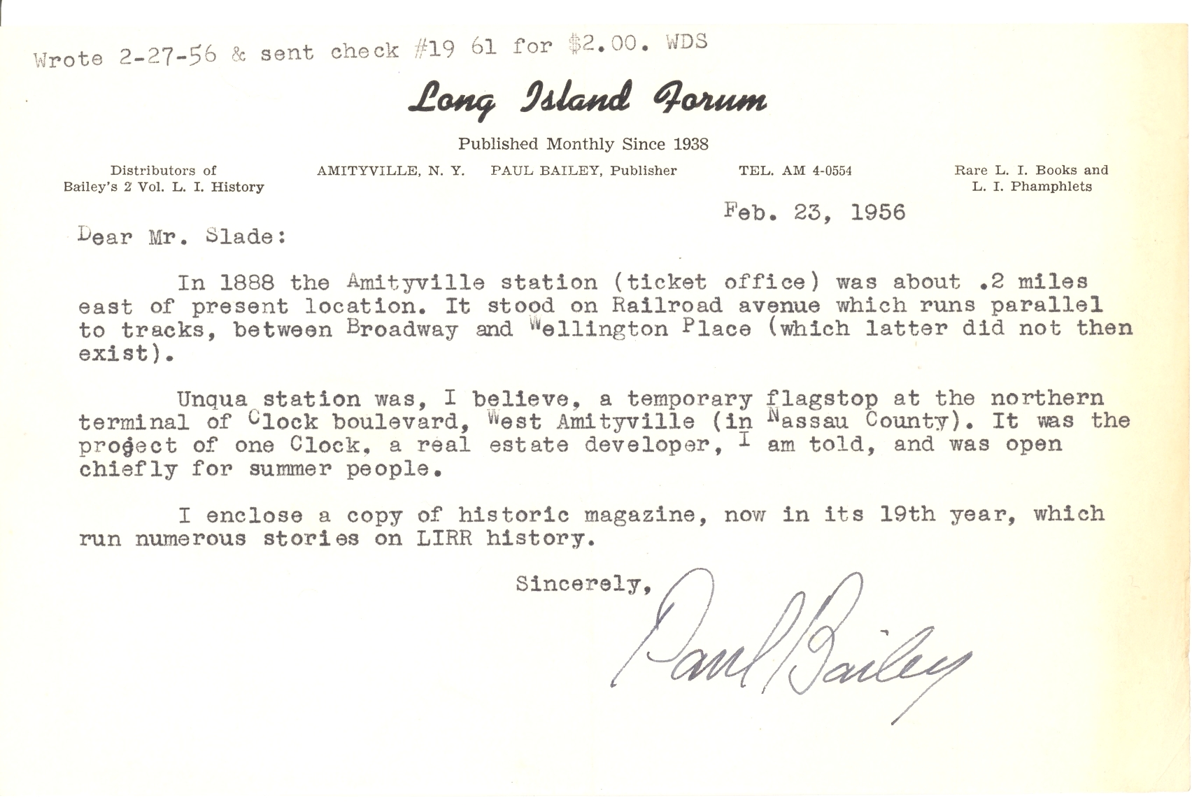 BILL SLADE RECEIVED THIS LETTER FROM PAUL BAILEY OF THE LONG ISLAND FORUM